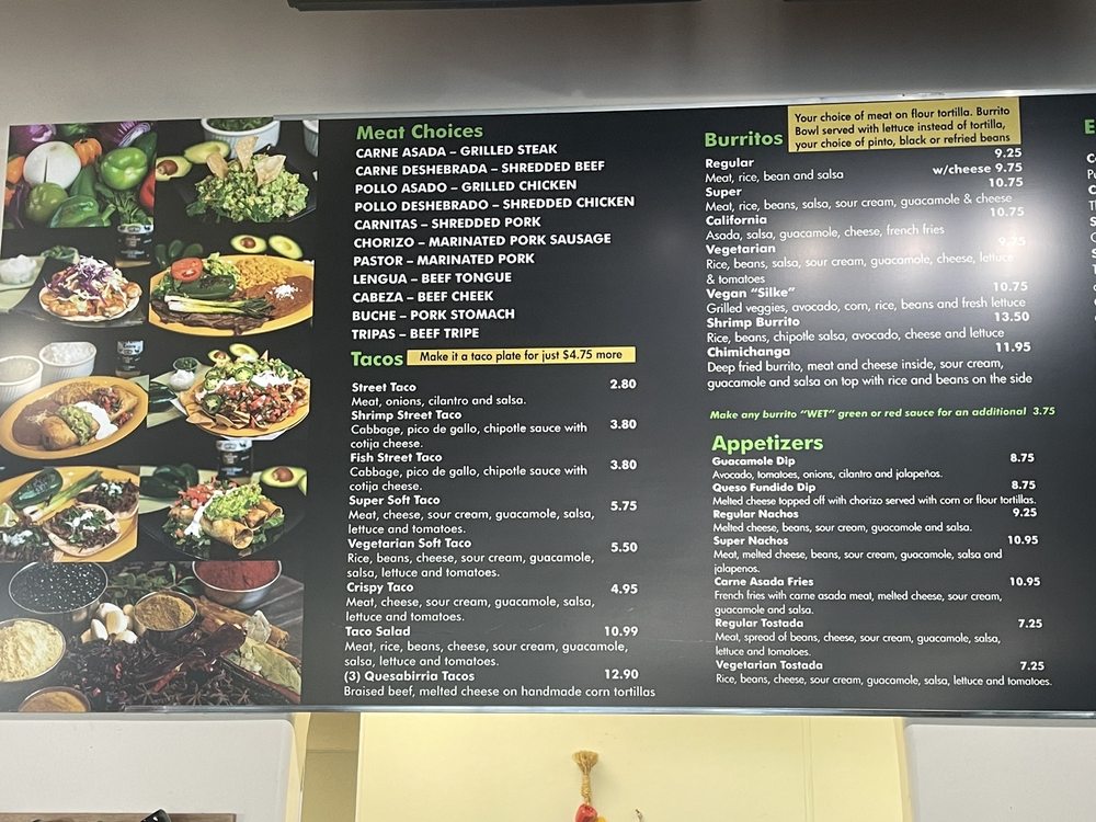 Your choice of meat, beans, served with rice, salsa, sour cream, guacamole and cheese.
