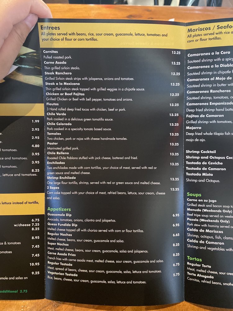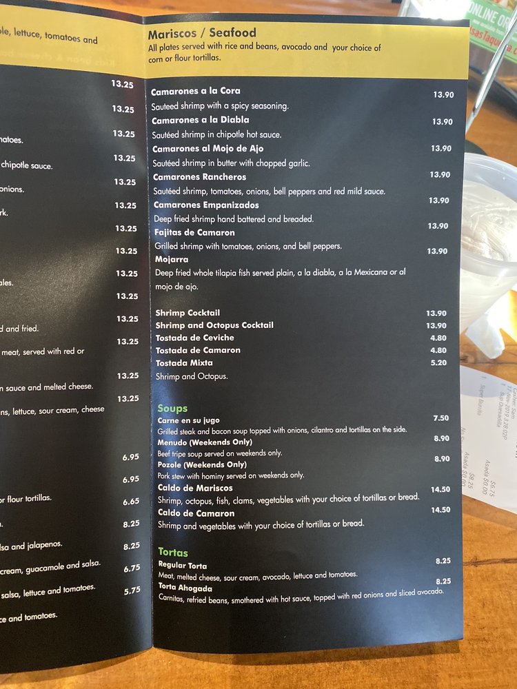 Shrimp, octopus, fish, clams, vegetables with your choice of tortillas or bread.